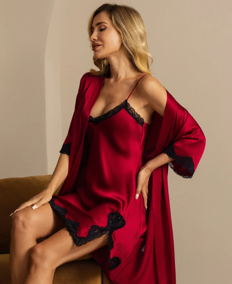 Conjunto 2 Piezas Camisón y Bata con Borde de Encaje en Seda Pura con Abertura