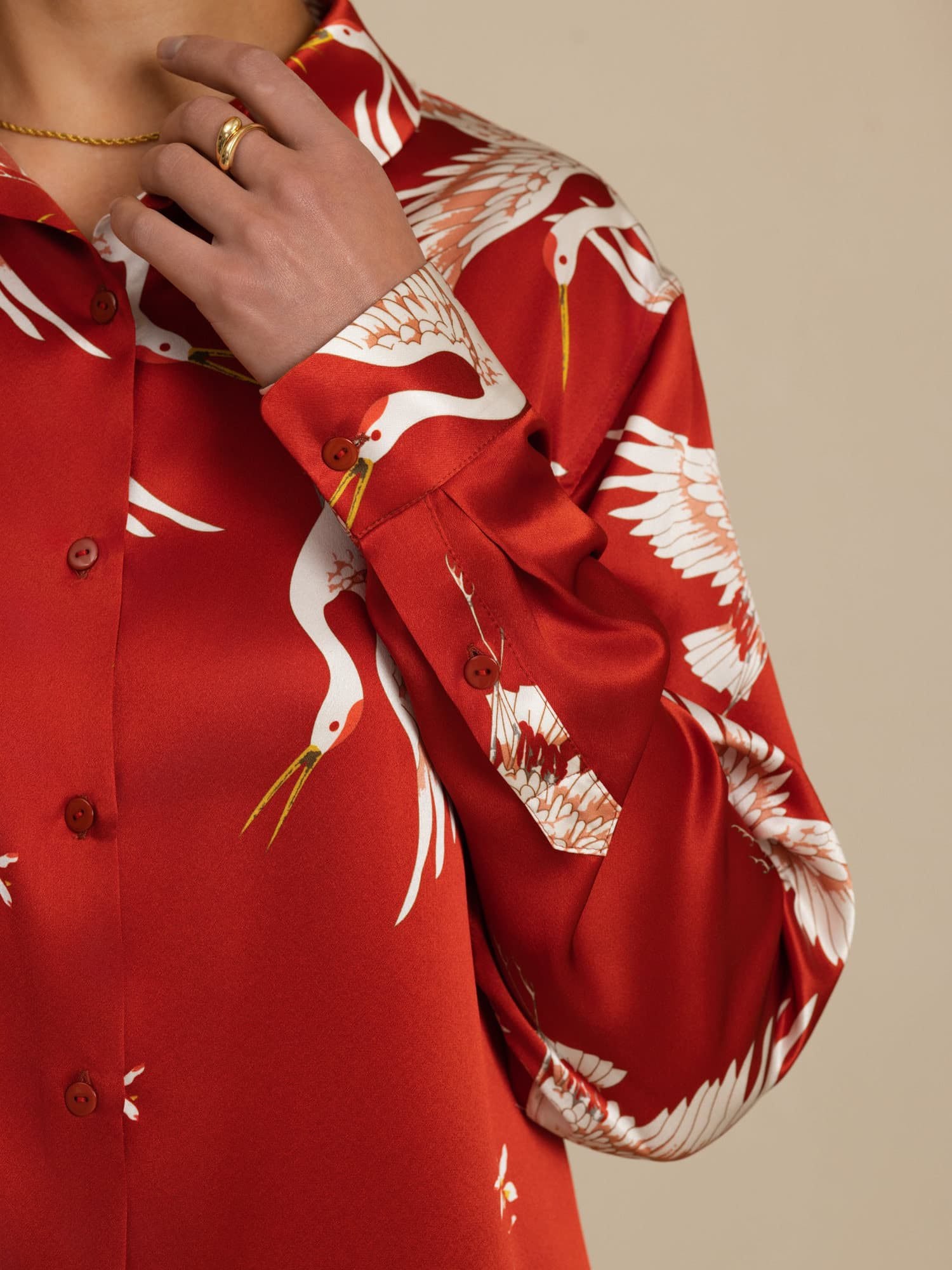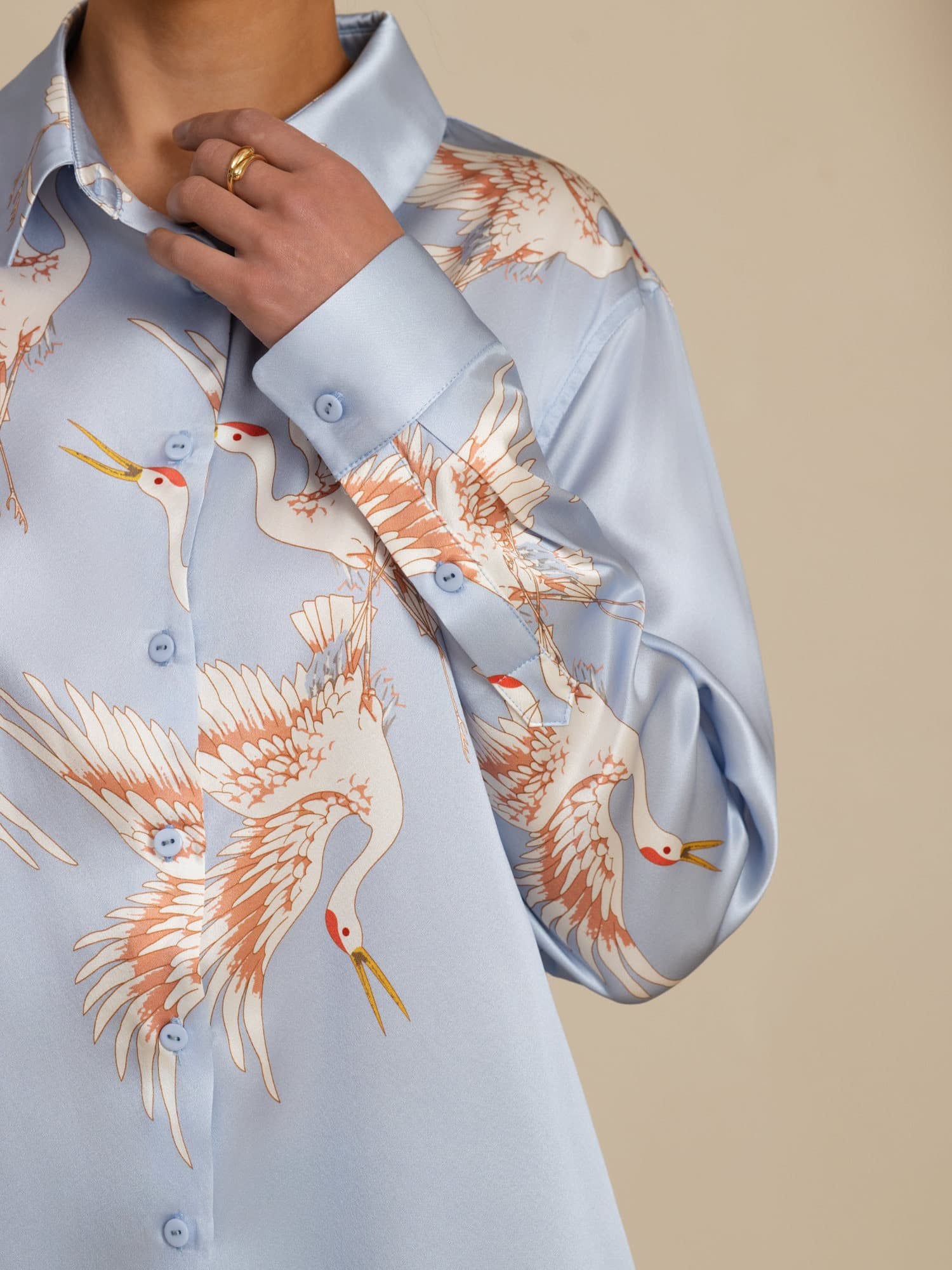 Elaborada con 100% seda pura, esta blusa ofrece una sensación suave, ligera y transpirable sobre la piel. El refinado patrón de grúas agrega un toque de elegancia oriental atemporal, mientras que el clásico cuello de camisa y el diseño de cierre con botones aumentan la versatilidad tanto para el trabajo como para el ocio. Con su caída fluida y su suave brillo, eleva el vestuario diario con un lujo discreto. Una mezcla perfecta de comodidad, sofisticación y estilo perdurable.