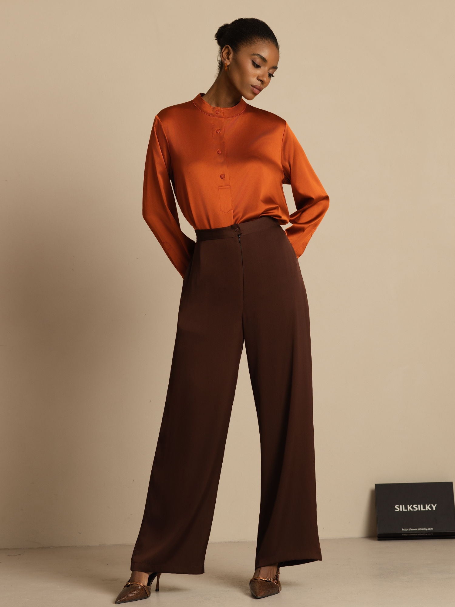Confeccionada en mezcla premium de seda 19Momme SilkFlex, esta blusa ofrece una textura suave y ligera con un sutil estiramiento para mayor comodidad. El cuello alto estructurado y el refinado cierre de botones crean un look pulido y atemporal. El dobladillo High-Low aporta movimiento y dimensión modernos, elevando el diseño clásico en color sólido. Elegante y versátil, se adapta fácilmente del entorno de oficina a estilismos diarios sofisticados.